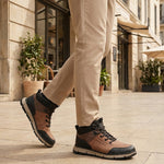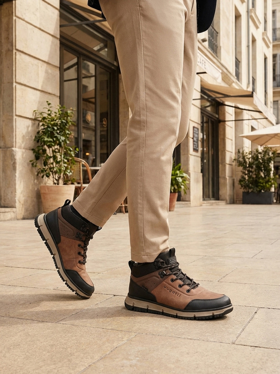 The commander of attention. bugatti Samper cognac and black high-top sneakers. The uppers, crafted in premium leather, sit atop lightweight EVA outsoles. A pair designed for the urban explorer.
