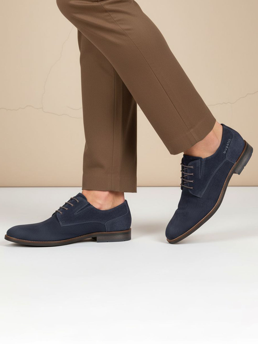 A trendsetting design rooted in traditional sensibilities. bugatti Sula dark blue derbies. Made in genuine leather with a Used Look finish. Genial Insole and TPR outsoles for an unparalleled walking experience.