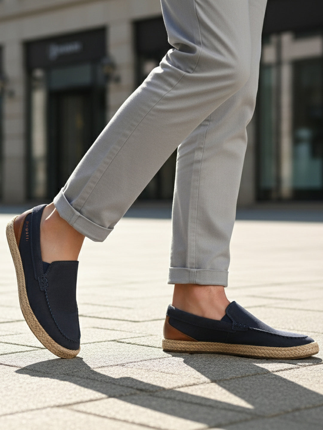 bugatti Spendril dark blue leather espadrille with a Used Look finish. The contemporary colour and design make it smart enough to be paired with a tailored trouser and shirt. The latest from Europe.