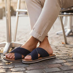 The perfect blend of fashion and functionality. bugatti Cobie dark blue cross-strap leather sandals. These come with the Soft Fit insoles and EVA outsoles, ensuring comfort in every stride.