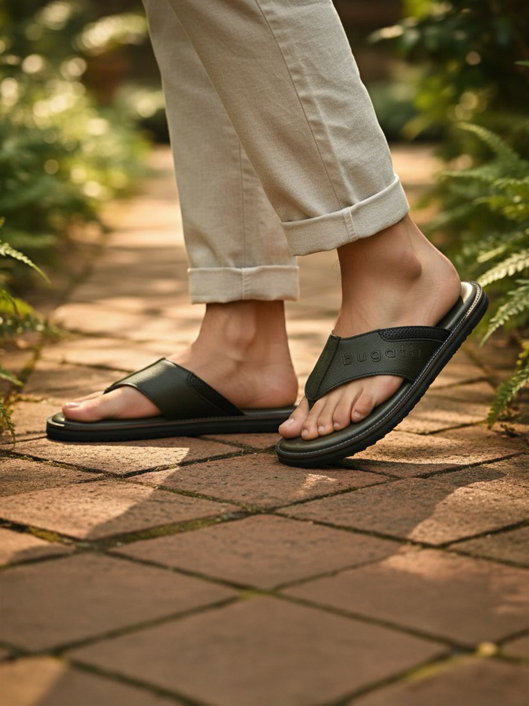 Elevate your summer style with the bugatti Cobie dark green and black thongs. The leather uppers and open-toe design ensure a breezy walking experience. The latest from the streets of Europe.