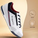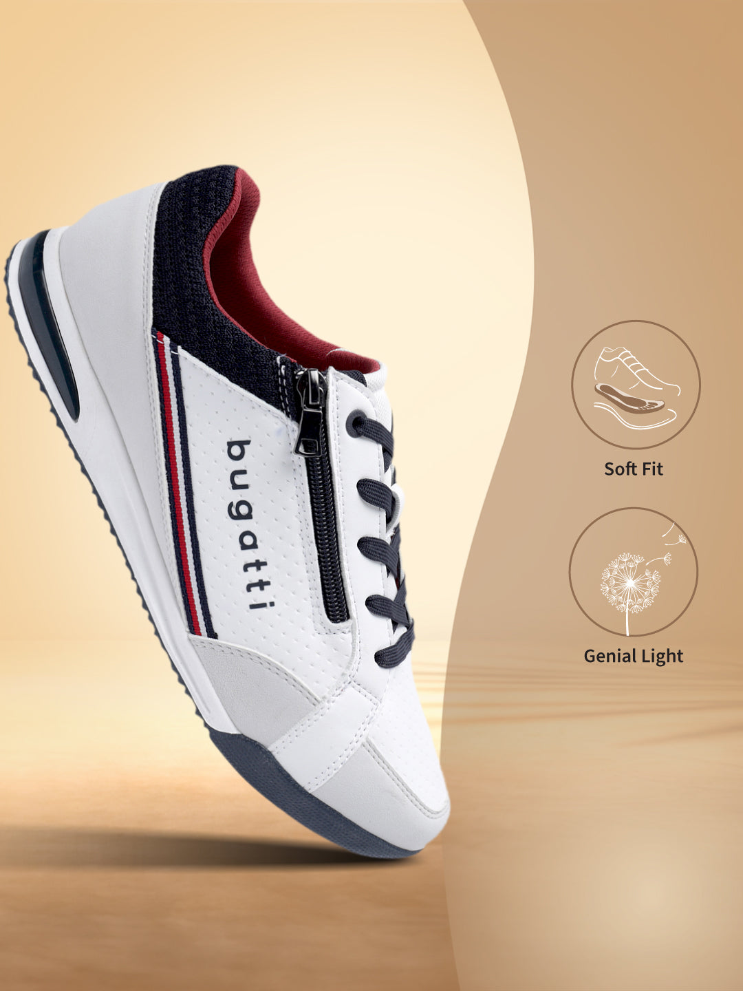 Character-defining style comes naturally with bugatti Trevor white and dark blue sneakers. Made from vegan materials. These round-toe shoes feature the Soft Fit and Genial light functionality.